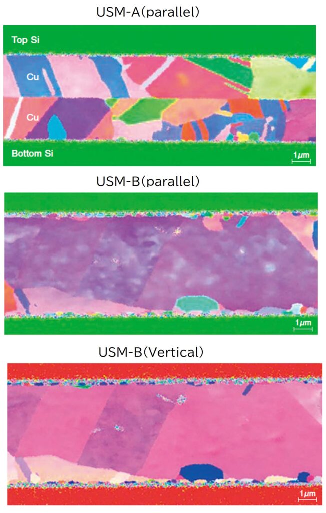 EBSDにより得られた接合断面の結晶方位マップを図4に示す。USM-Aを用いたCu-Cu間の接合では明確に接合界面が存在する。一方、USM-Bを用いたCu-Cu間の接合では接合界面が確認できず、Cuが単結晶粒であることを確認できる。さらに、Cu単結晶粒が二次元的ではなく三次元的に粒成長していることを確認するため、断面垂直方向の結晶方位マップも取得した。断面平行方向と垂直方向の結晶配向は類似しており、三次元的な粒成長によって、上下パッド間にCu単結晶粒が形成されたことを示している。これらの結果から大気圧雰囲気下で酸化膜が形成されたCu表面においても、USM層は原子拡散を円滑化し、接合界面における原子再配列を促進することが示された。これにより、構造的連続性を有するCu単結晶粒の形成に成功した。