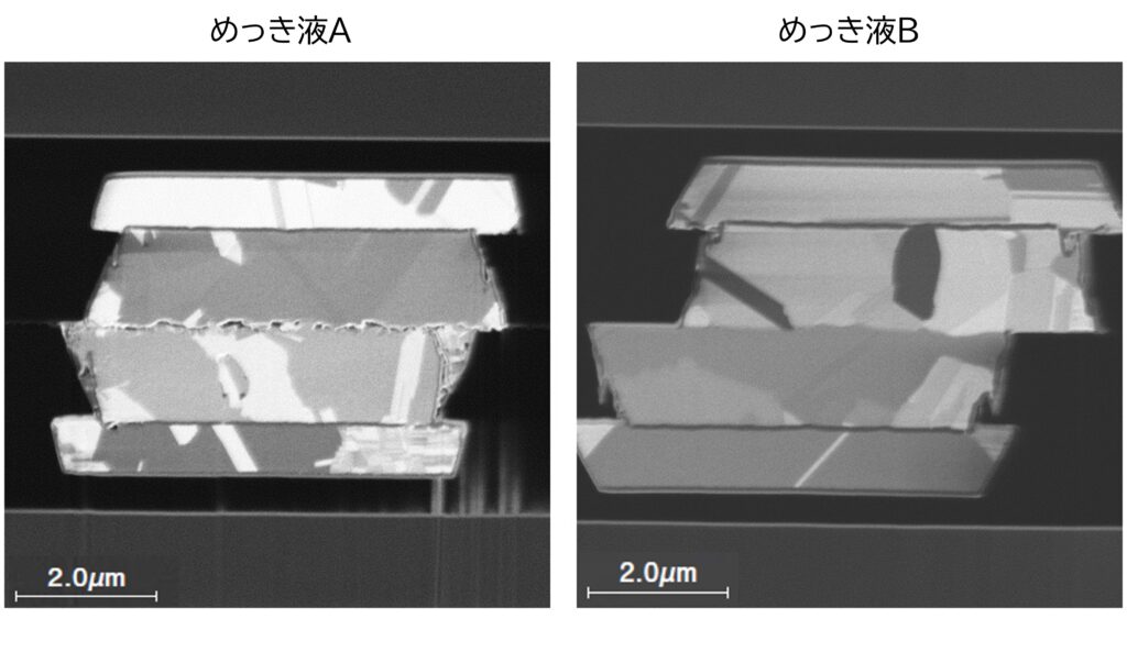 めっき液Aおよびめっき液Bで、Cuを析出させたTEGウエハを用いてハイブリッド接合した断面SIM像を図2に示す。めっき液Bを用いた電極は、めっき液Aを用いた電極と比較して結晶粒径が大きく接合界面にボイドも認められない。これらの結果から、Cuの結晶粒径および結晶方位がハイブリッド接合の品質に大きな影響を及ぼす可能性が示唆される。