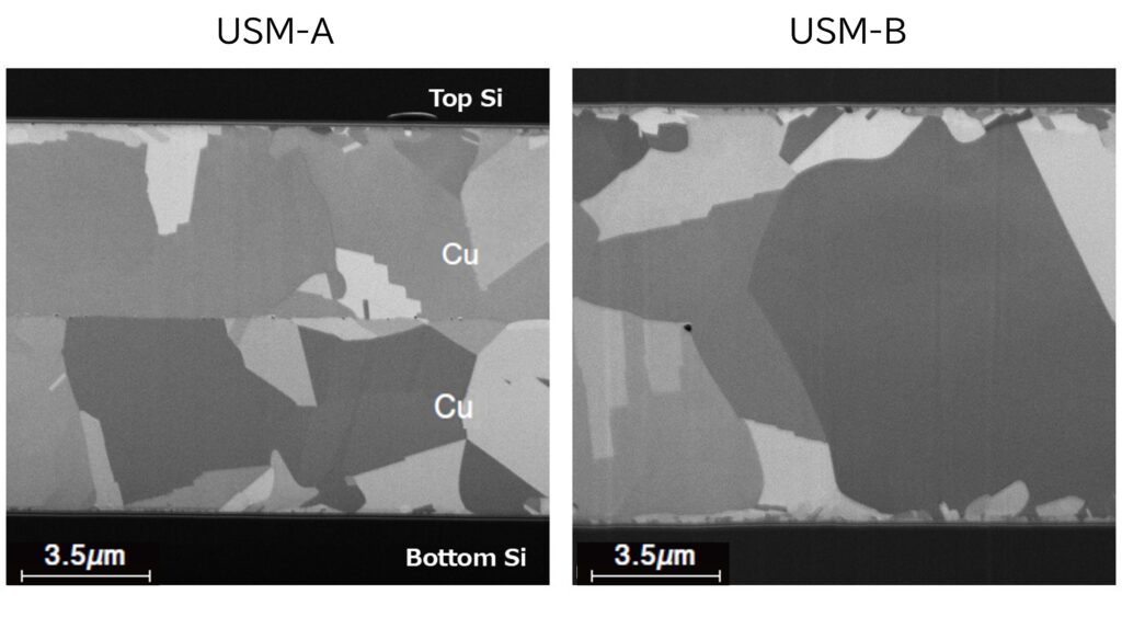 FIBにより加工した接合断面SIM像を図3に示す。USM-Aを用いた接合では上下のパッド間に接合界面が明確に確認できる。また、粒径は3~5μm程度である。一方、USM-Bを用いた接合では上下のパッド間に接合界面が存在せず、Cu単結晶粒接合を確認した。また、粒径10μm程度と顕著な粒成長が認められた。