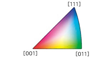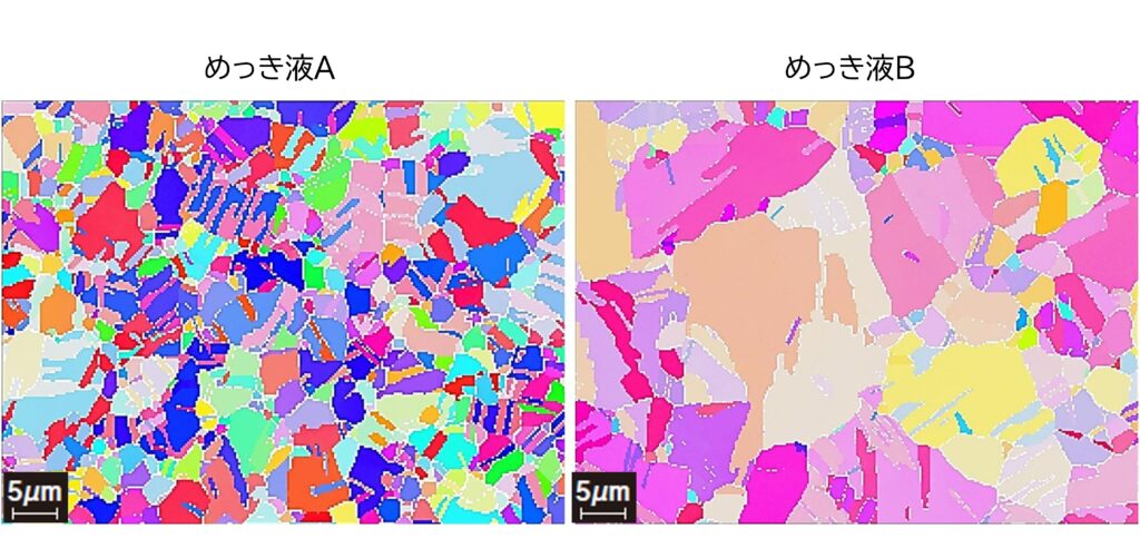 得られた2種類のCuを熱処理し、表面の結晶状態を後方散乱電子回折(EBSD)により評価した。Cu表面の結晶方位マップを図1に示す。めっき液Aで析出させたCuは2μm以下の粒径で、結晶学的に無秩序な方位分布を呈している。一方、めっき液Bで析出させたCuは5μm以上の粒径を多数観察し、結晶方位も類似している。